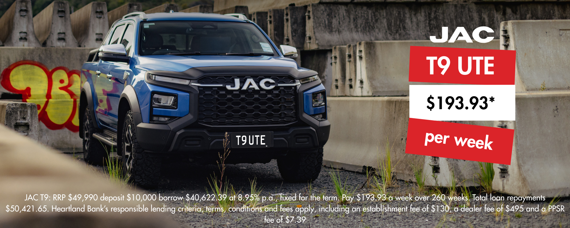 JAC T9: RRP $49,990 deposit $10,000 borrow $40,622.39 at 8.95% p.a., fixed for the term. Pay $193.93 a week over 260 weeks. Total loan repayments $50,421.65. Heartland Bank’s responsible lending criteria, terms, conditions and fees apply, including an establishment fee of $130, a dealer fee of $495 and a PPSR fee of $7.39